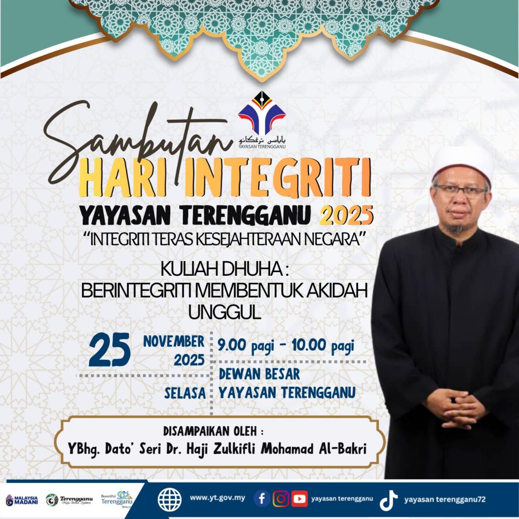 Yayasan Terengganu, 25 Nov 2025: Yayasan Terengganu telah mengadakan Sambutan Hari Integriti Tahun 2025 dalam suasana penuh berinformasi dan berfokus kepada pembudayaan nilai integriti dalam kalangan warga kerja serta masyarakat. Seramai lebih kurang 10 orang Kakitangan Yayasan Terengganu di SM Imtiaz YT Terengganu berpeluang untuk hadir ke majlis tersebut.