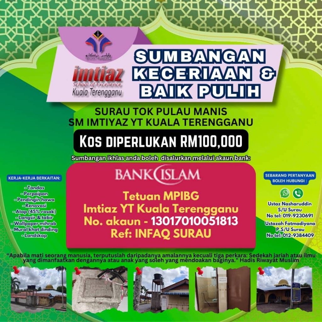 Surau Tok Pulau Manis merupakan pusat beribadah bagi warga iKT, dimana para pelajar akan solat secara berjemaah dan dijadikan sebagai pusat hafazan Al Quran serta aktiviti lain yang berkaitan. Sehubungan itu, Pihak MPIBG SM Imtiaz YT Kuala Terengganu mengalu-alukan sumbangan infaq daripada semua dermawan dan kaum muslimin muslimat khasnya para alumni SM Imtiaz YT Kuala Terengganu dengan menyalurkan sumbangan anda ke akaun :