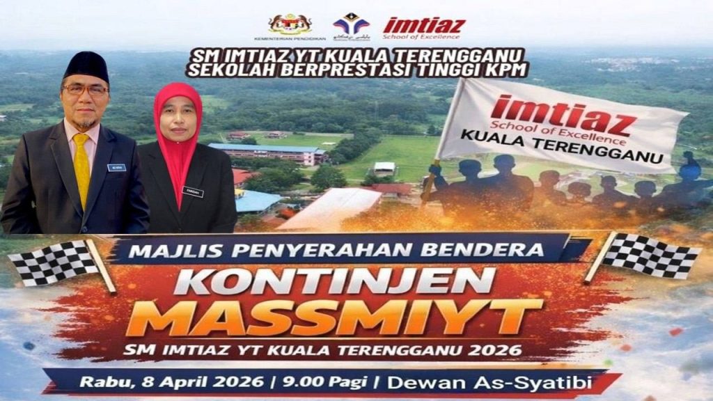 Ayahanda pengetua, Ustaz Md Imran telah menyempurnakan Majlis Penyerahan Bendera Kontinjen MASSMIYT di Dewan As-Syatibi sebagai simbolik pelepasan rasmi ke Kejohanan Sukan MASSMIYT 2026 yang berlangsung di Sek. Men. Imtiaz YT Kemaman bermula hari ini.