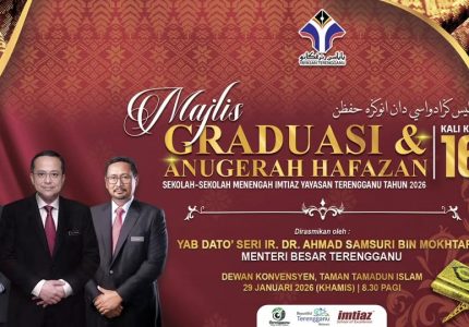 Taman Tamadun Islam, 29 Januari: Seramai 97 orang pelajar hufaz yang berjaya mengkhatamkan 30 juzuk Al-Quran dari SM Imtiaz YT Kuala Terengganu telah dijemput hadir ke Majlis Graduasi & Anugerah Hafazan Kali Ke-16 Sekolah-sekolah Menengah Imtiaz Yayasan Terengganu. Anugerah tersebut telah disampaikan oleh Pengerusi Jawatankuasa Pendidikan, Pengajian Tinggi, Sains, Teknologi dan Pembangunan Insan yang mewakili YAB Menteri Besar Terengganu.