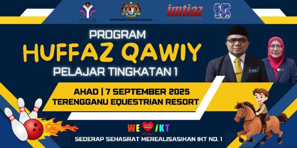 Terengganu Equestrian Resort, 7 Sept 2025: Pihak sekolah telah menganjurkan sebuah program Huffaz Qawiy yang melibatkan semua pelajar Tingkatan 1. Program ini dikategorikan sebagai latihan sambil belajar yang mana aktiviti tersebut dapat memberi peluang kepada murid mengkaji, menganalisis dan membuat perbandingan apa yang mereka lihat dan pelajari. Di samping itu, ia juga dapat melatih pelajar mendisiplinkan diri sepanjang proses latihan diadakan. Oleh itu, pihak Penyelaras Tingkatan 1 bersama-sama Unit Ulul Albab SM Imtiaz Yayasan Terengganu Kuala Terengganu telah merangka satu program sunnah untuk mengisi masa lapang dan juga untuk memupuk semangat kesukanan serta memberikan pembelajaran sepanjang hayat kepada murid dengan dunia luar. Program ini juga merupakan tunjang dalam memperkasakan serta memperkukuhkan lagi peribadi pelajar dalam menerajui serta memimpin diri sendiri dengan melengkapkan personaliti yang berwibawa. Sebagai salah satu aktiviti yang dirancang, program ini diharap dapat memberi pelbagai manfaat kepada para murid dalam mendedahkan diri kepada dunia luar.
